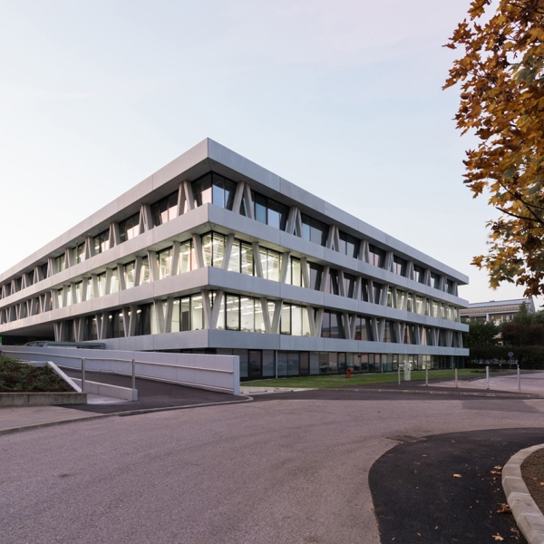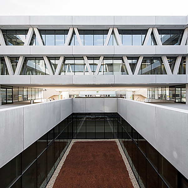 Markante V-Stützen formen den speziellen Charakter des NDU-Gebäudes. Die Konstruktion und Haustechnik des Bauwerks insgesamt offen zu legen und auf Verkleidungen zu verzichten, suggeriert nicht nur Klarheit, sondern fungiert geradezu als »Lehrbeispiel« für die angehenden Designer*innen und Techniker*innen. Reduktion auf das Wesentliche — dieser Grundsatz wurde auch in der Auswahl der verwendeten Materialien angewandt. Glas als thermische Hülle schafft maximale Transparenz. Beton als primärer Baustoff reflektiert die Nachbarschaft zum WIFI-Hauptgebäude, einem denkmalgeschützten Sichtbetongebäude aus der Feder von Karl Schwanzer.