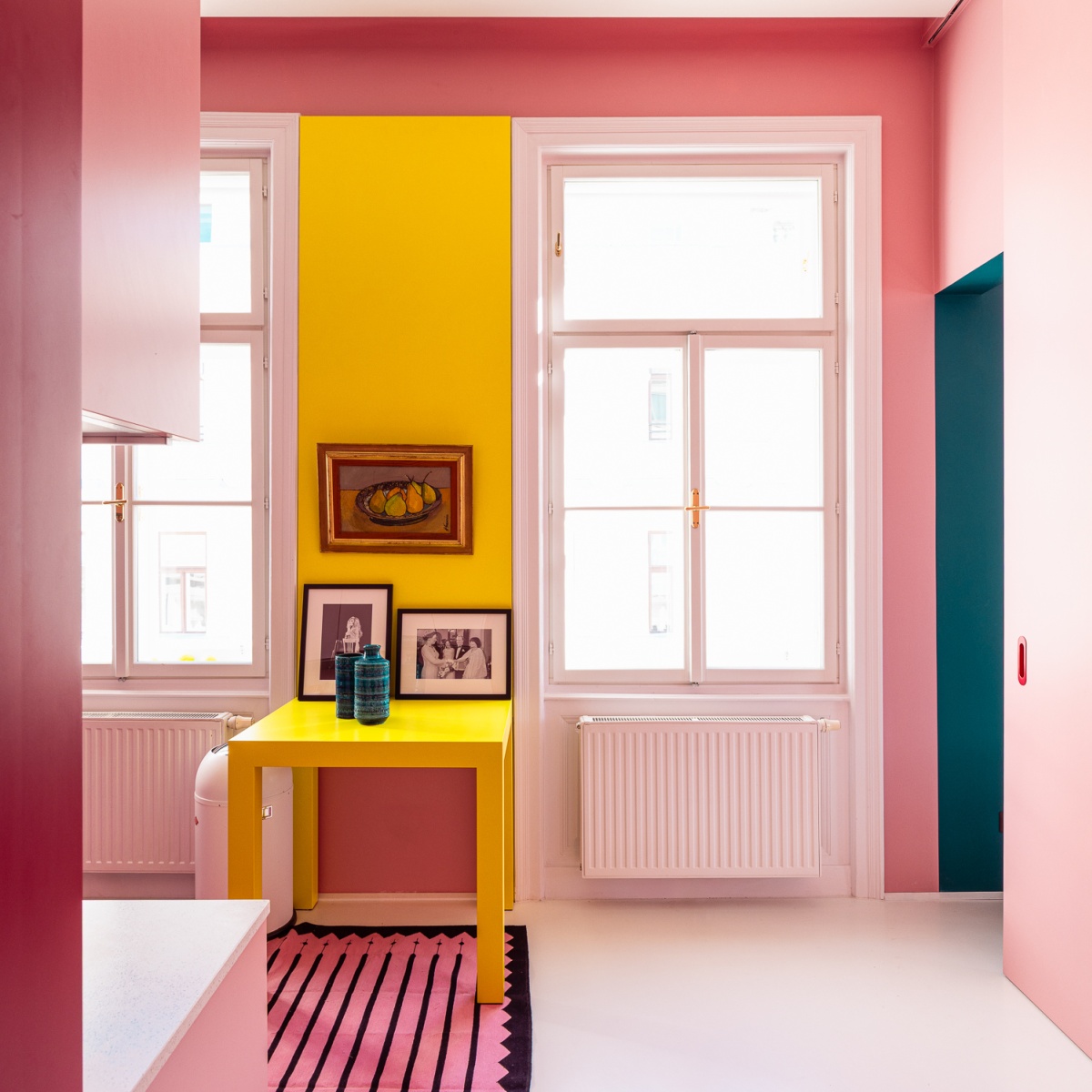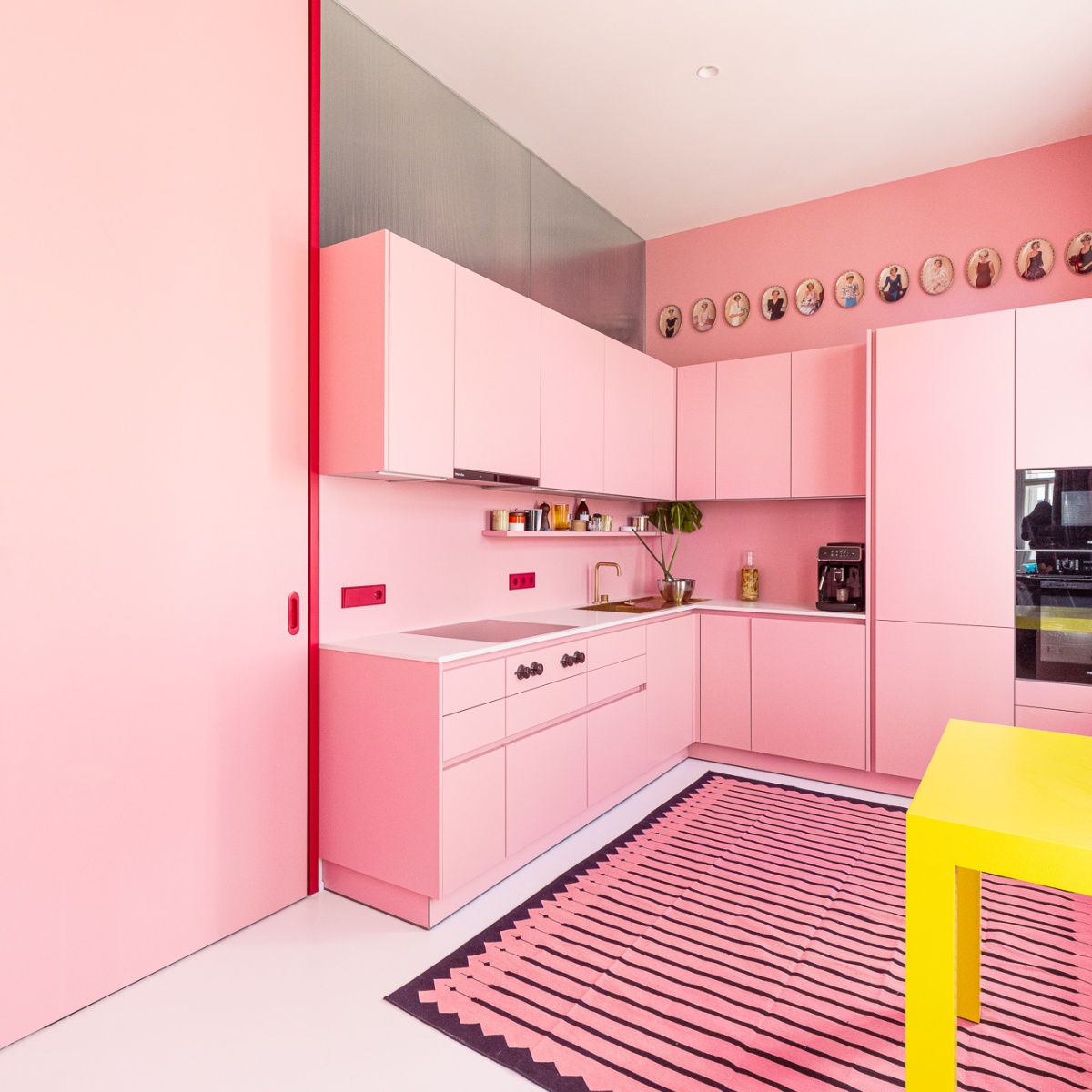 Die Küche ist als helle, monochrome Bühne in Rosa konzipiert. Reduzierte Flächen und klare Linien werden durch rote Details akzentuiert; Blickachsen verbinden die Küche mit dem tiefblauen Bad und öffnen sich weiter zum Wohnbereich.
