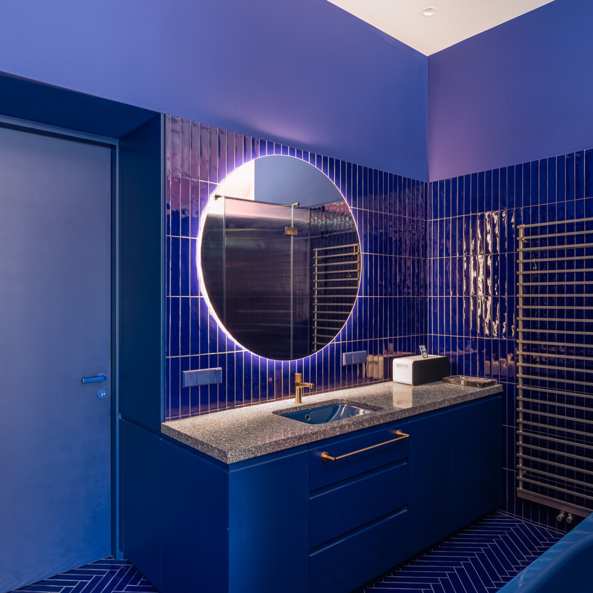 Das Bad liegt als verbindender Knotenpunkt zwischen Vorraum und Küche und ermöglicht als neue Verbindung eine Abkürzung innerhalb der Wohnung. Als indigoblaue Gegenwelt zur rosa Küche verdichtet es den Raum über hochglänzende Fliesen, Fischgrätboden und präzise Lichtpunkte.