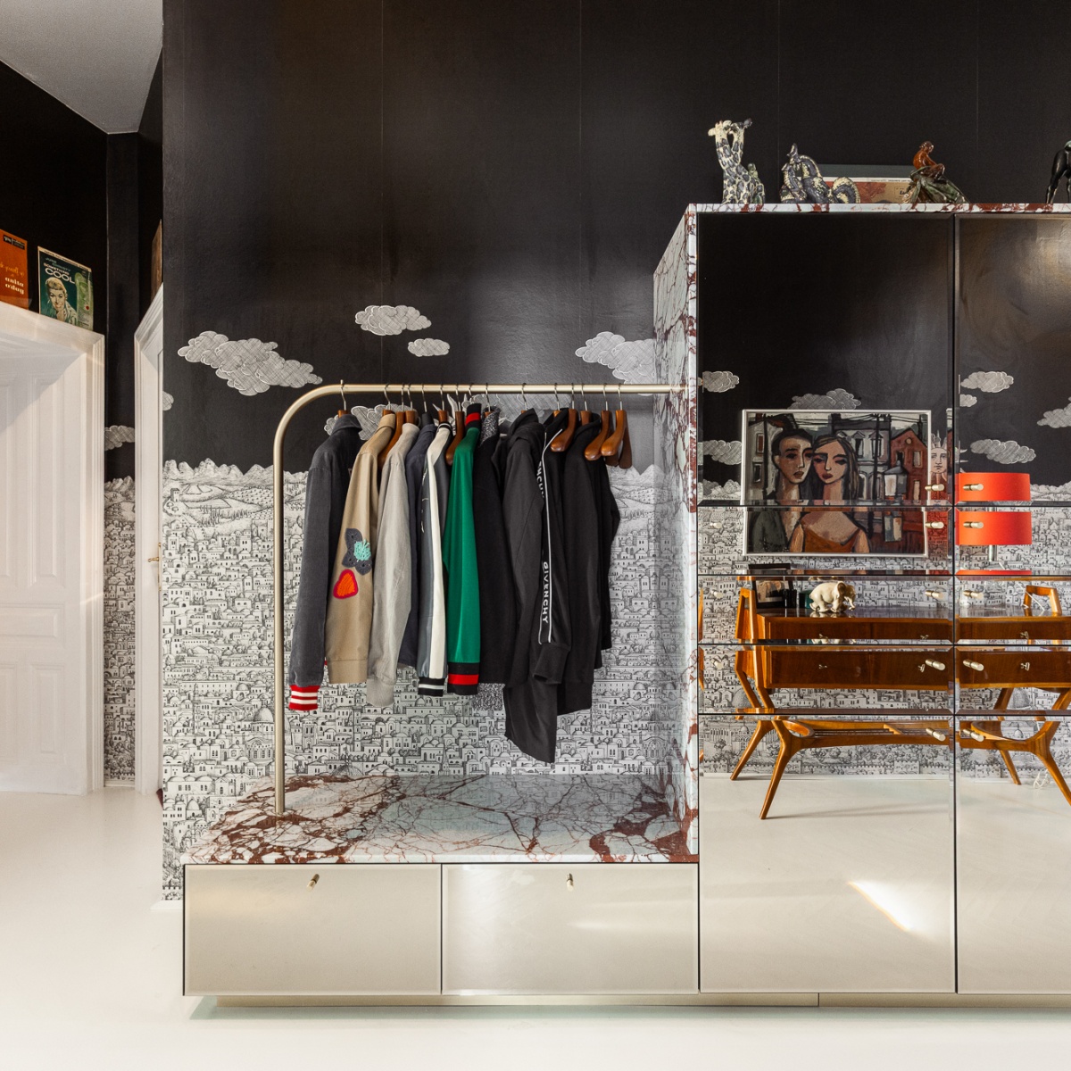 Der Vorraum bildet den grafischen Auftakt: Ein weißer Fischgrätboden schafft Ruhe, während eine Fornasetti-Tapete mit Stadtlandschaftsmotiv Tiefe und Narration erzeugt. Ein maßgefertigtes Spiegelglas-Möbel bündelt Ablage, Garderobe und Stauraum; seine getönten, facettierten Fronten fragmentieren das Tapetenbild und setzen mit rotem Marmor einen haptischen Akzent.