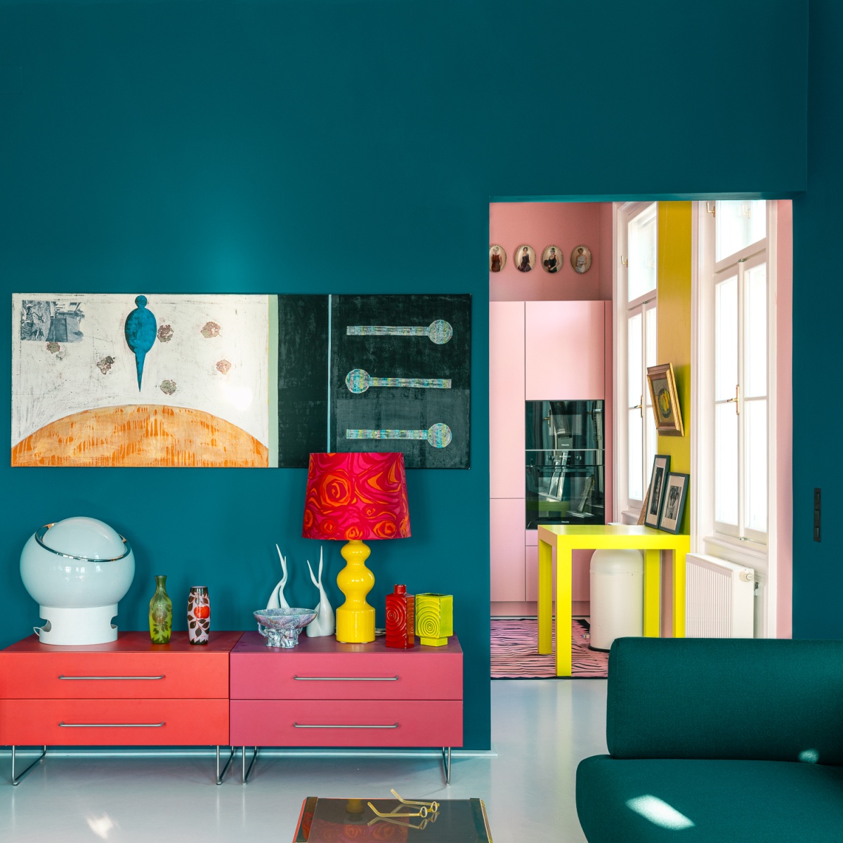 Das Wohnzimmer schließt die Sequenz als ruhiger Pol in Petrol: satt, textil und atmosphärisch, im Dialog mit der rosa Küche, die als helles „Lichtfeld“ in der Blickachse erscheint. So wird die Altbauwohnung als zusammenhängende Erzählung aus Farbe, Material und Raumtiefe erlebbar.