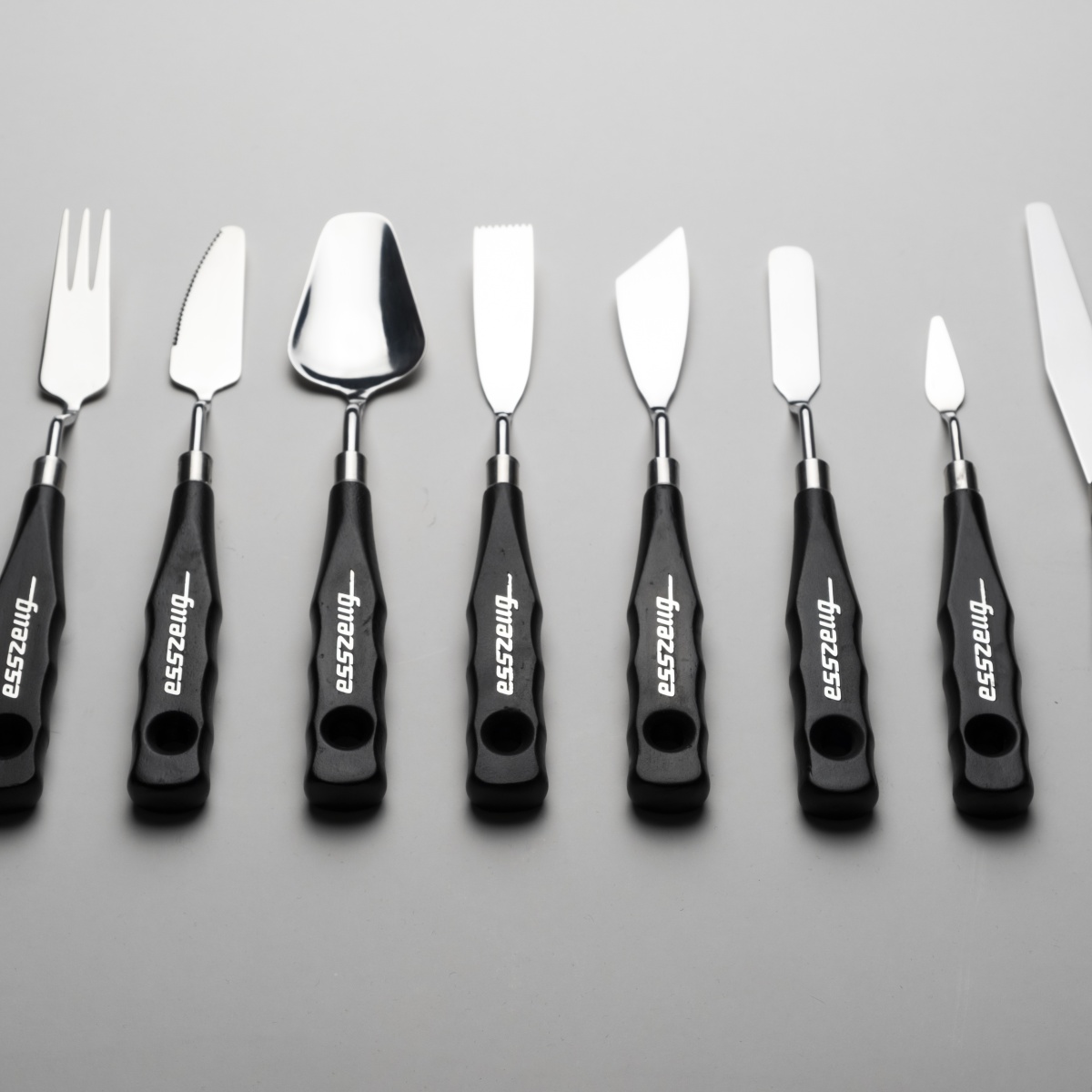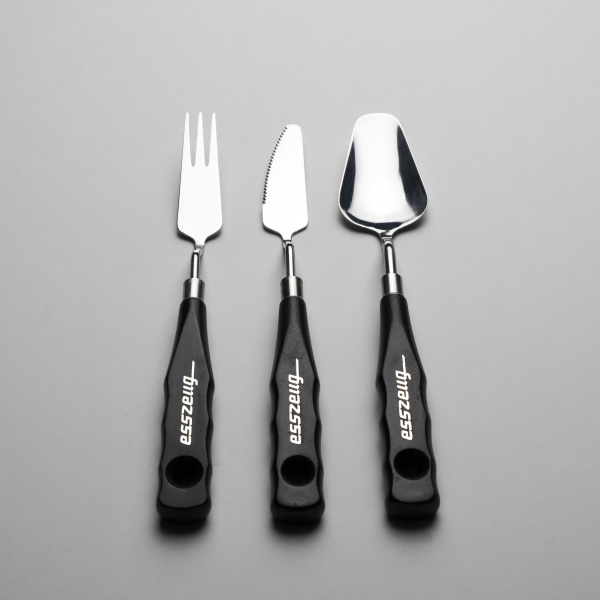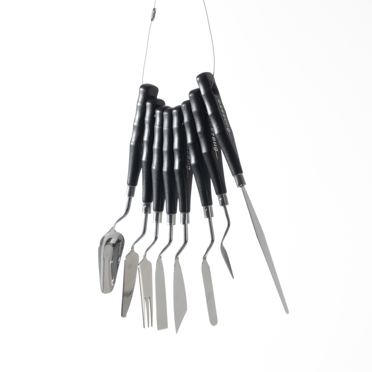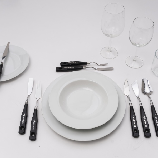 Künstlerspachteln und selbst entworfenem Besteckteilen besteht. Durch ein auf das Besteck abgestimmtes Menü sollen die Leute dazu aufgefordert werden sich aktiv mit den Werkzeugen mit denen sie Essen